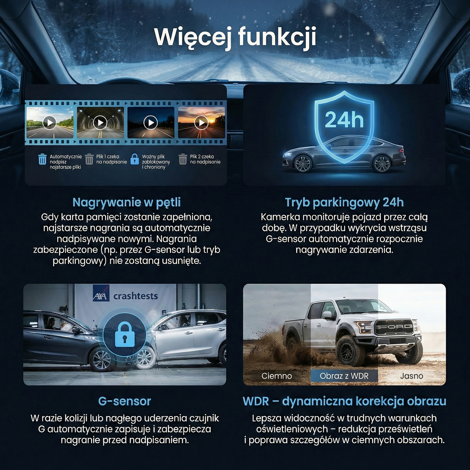 Kamera uruchamia się sama, nagrywa w pętli i zabezpiecza ważne zdarzenia — bez Twojej ingerencji.